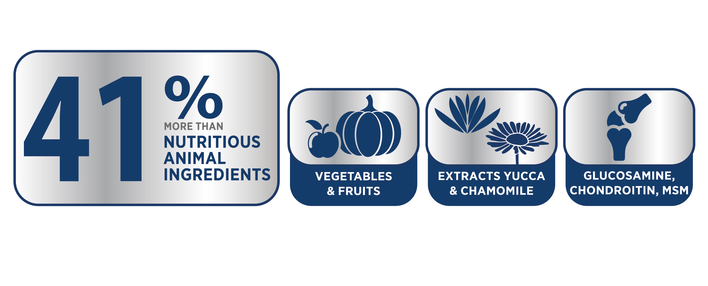 Состав: продукты животного происхождения более 41 % (мясо телятины, дегидратированное мясо и мясопродукты, черная львинка (легкопереваримый белок насекомых), жир птицы, рыбий жир, гидролизат из мяса, гемоглобин), рис, горошек, кукуруза и продукты ее переработки, кокосовое масло, яблоки, тыква, морковь, хондропротекторы (глюкозамин, хондроитин, метилсульфонилметан), экстракт ромашки, экстракт юкки, меласса и жом из сахарной свеклы, дрожжи (источник пребиотиков: маннанолигосахаридов, β-глюканов), глицерин, ферменты, натрия хлорид, витамины, микроэлементы, антиоксиданты, сорбат калия